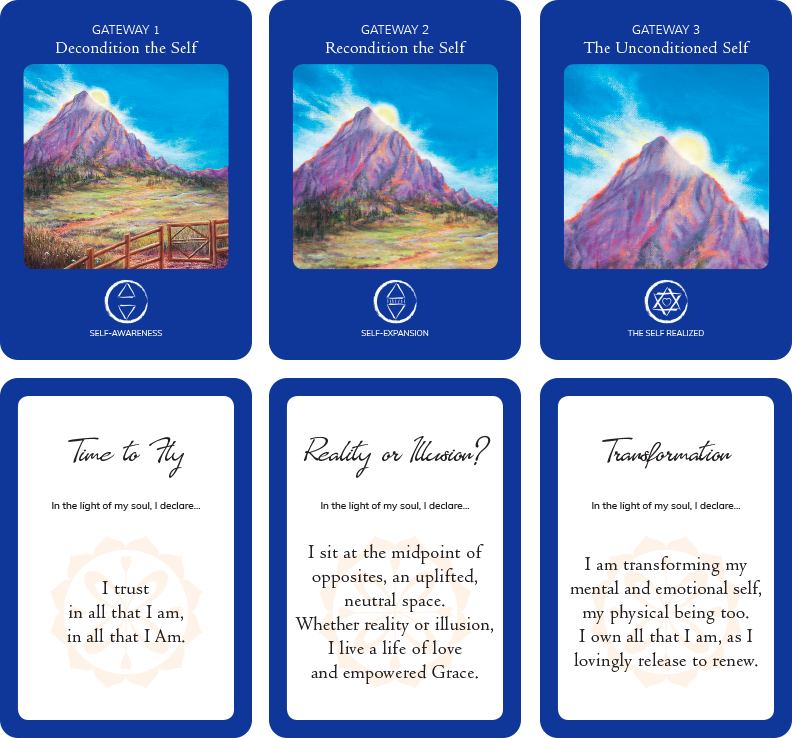 On one side of the cards is the gateway. The gateways are sections of the book and stages of awareness.